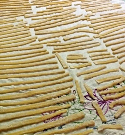 Homemade Noodle days were such an event at our house growing up. We all looked so forward to those rare days. Well-worn old embroidered cloths were placed all over the kitchen table and counters and the noodles were laying next to each other, row after row of deliciousness. We would sneak into the kitchen and quietly and carefully slip raw, drying noodles off the table and into our mouths. When we took one, we would always shift the other noodles on either side of it so it would go unnoticed by Mom. "Stay out of that kitchen!” “Stay away from those noodles!” We all heard Mom saying these things every single time we had a Homemade Noodle day. Every time! The dried, raw noodle was incredibly yummy, but when they cooked in their delicious broth they plumped up and were oh so heavenly. Lucky us to have experienced such a wonderful tradition.